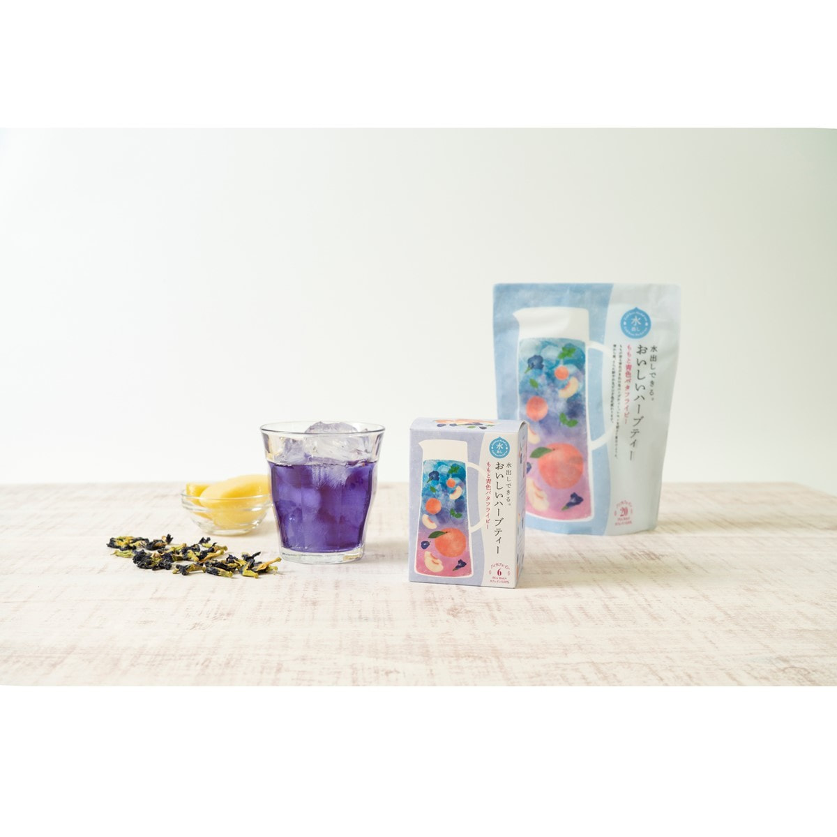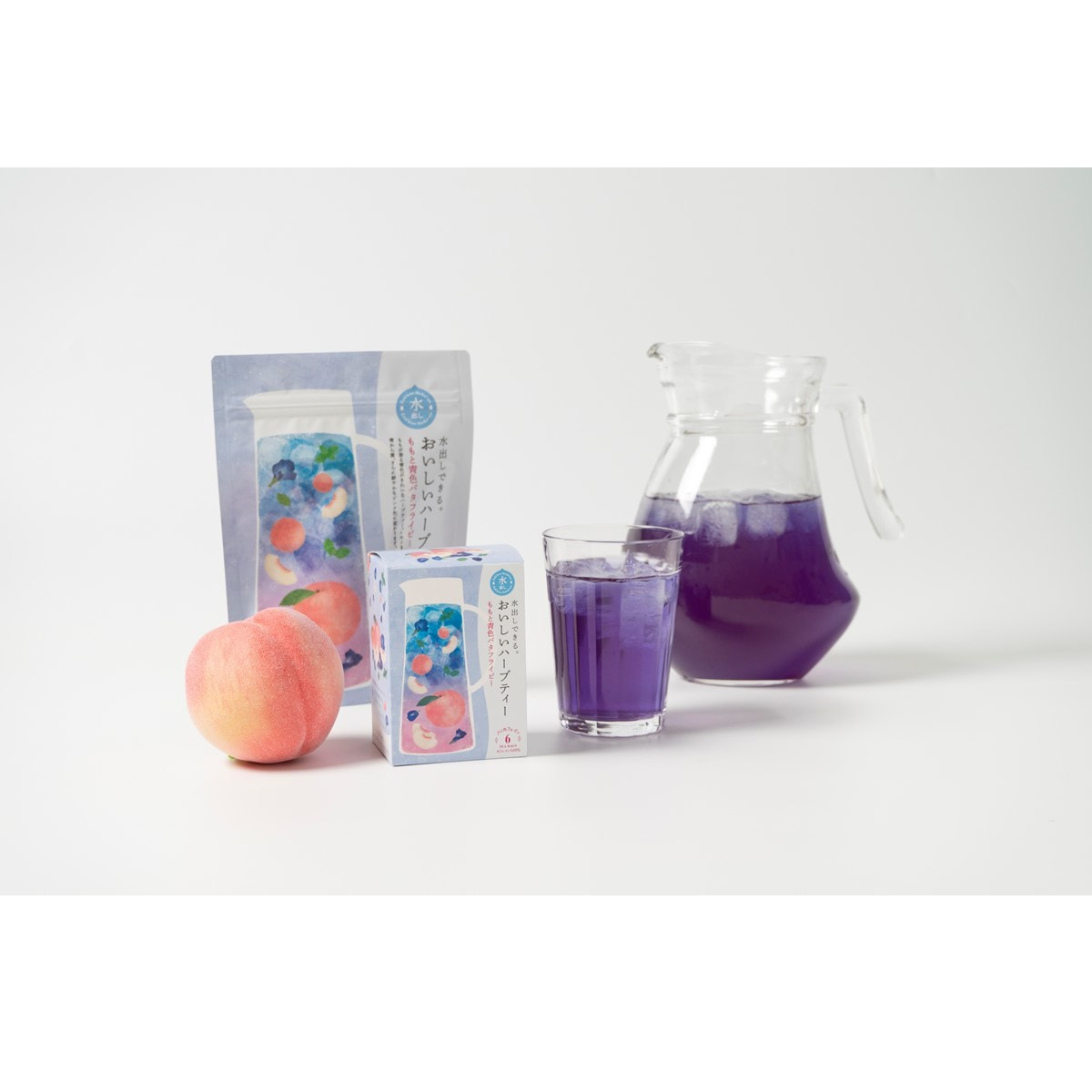 ももが香る、青色のきれいなハーブティー。